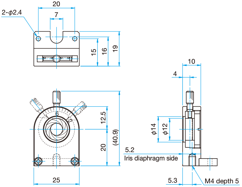 Iris diaphragm holders that can change the aperture size without changing the center of the aperture. Can be used to change the depth of field in imaging systems. And passing necessary laser beam while blocking optical feedback or stray light in laser experiments.