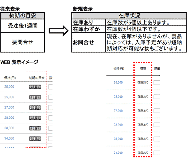 WEBカタログで表示をしています「納期の目安」を「在庫表示」に変更いたします。